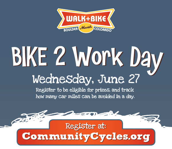 Be sure to register so they can get an idea of how many folks will be out and about! Work from home? No matter, just trade in a car trip for a bike trip and register anyway. It counts! Walk & Bike Month & Bike to Work Day is not just about biking to work, because some people just can’t do that. It is about choosing the best way to get around each time you leave the house. If you have to go to Erie, maybe you can only drive, but if you live a half a mile from the gym, try biking there next time. Given all the personal, environmental and global impacts of private automobile use, it is now, more important than ever that Boulder maintain and build on its strong commitment to walking and biking! It starts with every person committing to walk or bike at least one day in June and letting our city government know that being able to walk and bike safely and easily in Boulder is part of what makes our town great! |