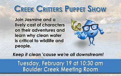 Creek Critters Puppet Show is presented by the Boulder Public Library. Join a lively cast of characters on their adventures along Boulder Creek to learn why clean water is important to wildlife and people and how we can help keep our watershed clean. February 19, 2013 at 10:30am in the Boulder Creek Meeting Room at the Main Boulder Library. More information here.