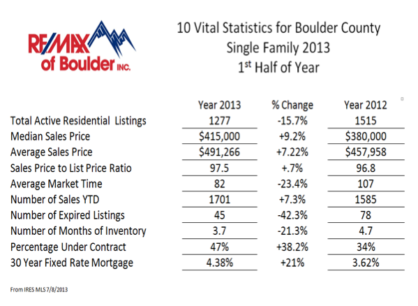 Real Estate10 Vital Statistics for Boulder County Single Family Homes for the First Half of 2013 July 20, 2013July 19, 2013 janetleap The first half of 2013 has been a big one for Boulder County real estate. Here are some of the most important statistics for the year thus far. Have any questions? I would love to talk! Click to share on LinkedIn (Opens in new window) LinkedIn Click to share on Facebook (Opens in new window) Facebook Click to print (Opens in new window) Print Click to share on X (Opens in new window) X Click to email a link to a friend (Opens in new window) Email Like Loading... Related