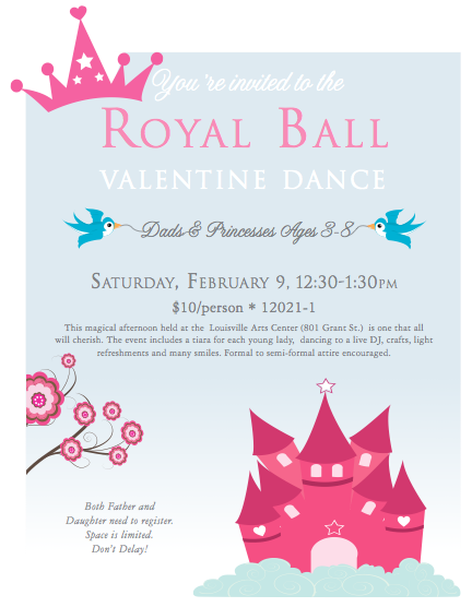 The Louisville Royal Ball Valentine’s Day Father/Daughter Dance is happening this year on February 9, 2013. This magical afternoon for fathers and daughters [ages 3 to 8] is held at the Louisville Arts Center (801 Grant St.) from 12:30 to 1:30pm. The event includes a tiara for each young lady, dancing to a live DJ, crafts, light refreshments and many smiles. Formal to semi-formal attire encouraged. Cost: $10/person. Must register here.