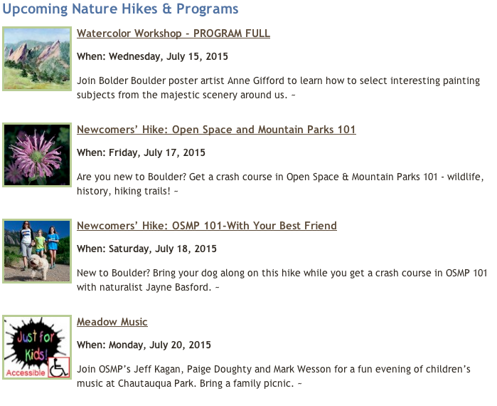 With all the talk about getting outside I want to remind everyone of a great resource right here in the Boulder area – City of Boulder Parks and Open Space.