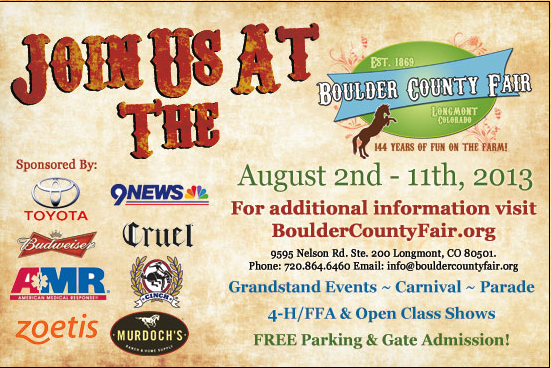 Fair Time in Boulder! The Boulder County Fair is the oldest fair in Colorado, operating since 1869. Kids, Families, and Friends of all ages enjoy FREE entertainment every day of the fair. Eat to your heart’s content. Take a spin on our carnival rides. Enjoy nightly concerts and rodeos throughout the fair! Now through this August 12, 2018. Get the full details on everything fair related @ Boulder County Fair Website.